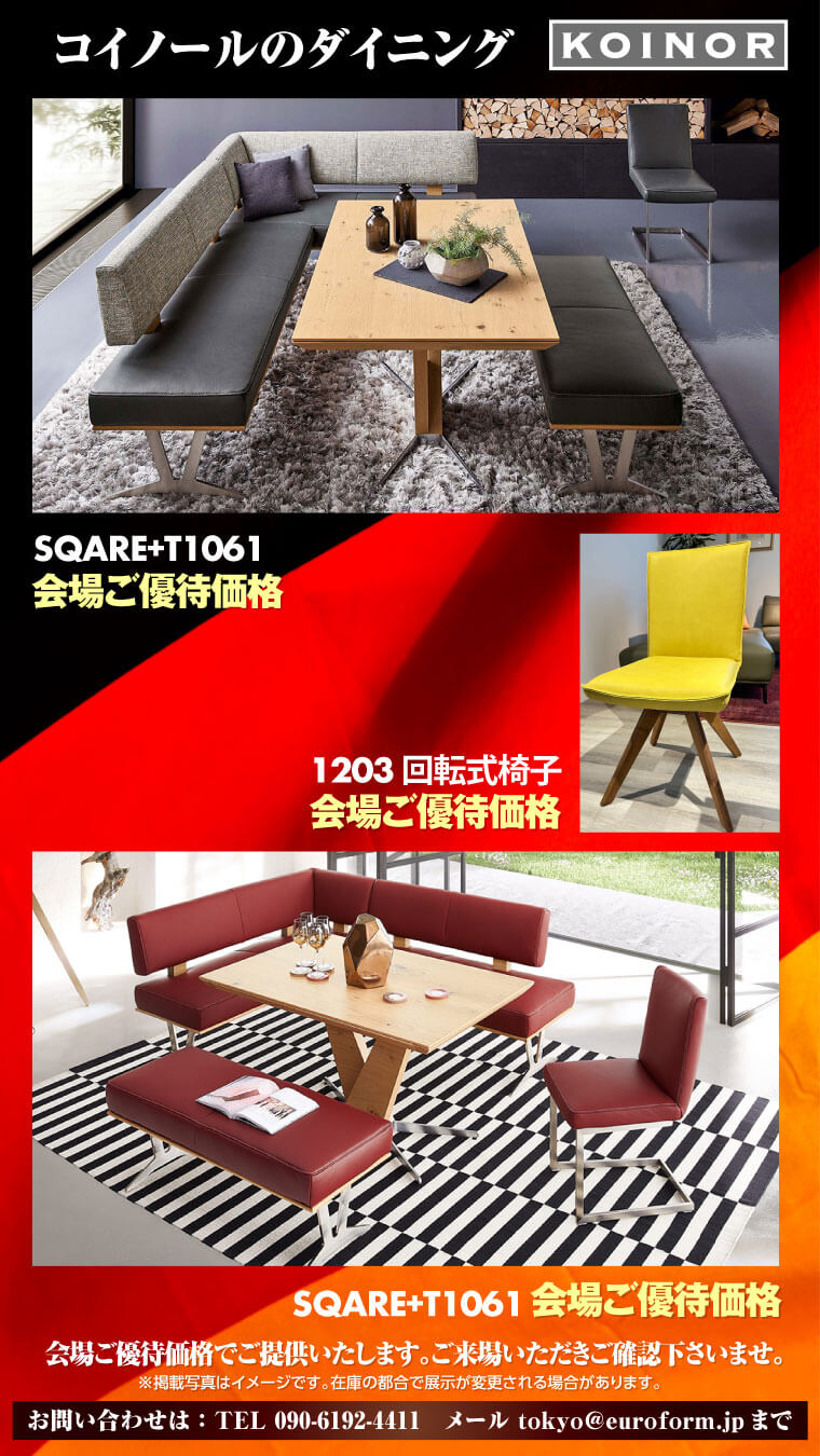 | 展示予定商品 | ●革張りソファ:ドイツ・コイノール、イタリア・ニコライン、イタリア・カリア ●伸長・上下昇降式テーブル:イタリア・オッジオ、その他メーカー |
