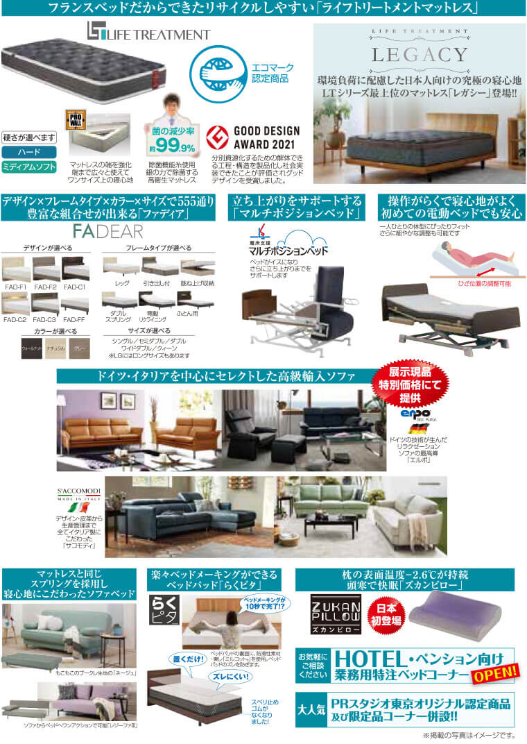 ベッドフレーム各種、リクライニングベッド、電動ベッド各種、ナイトテーブル、マットレス各種、ライフトリートメントシリーズ、リハテック、電動リクライニングベッド、グランマックス/GRANMAX、PLEOX、RP-1000、低反発フォームマットレス各種、海外製デザイナーズ輸入ソファー各種、輸入ブランドソファー各種、ソファ各種、パーソナルチェア各種、ソファベッド各種、羽毛布団、寝具(ベッドリネン、ベッドカバー、シーツ、ベッドパッド)、枕、リビングテーブル 他