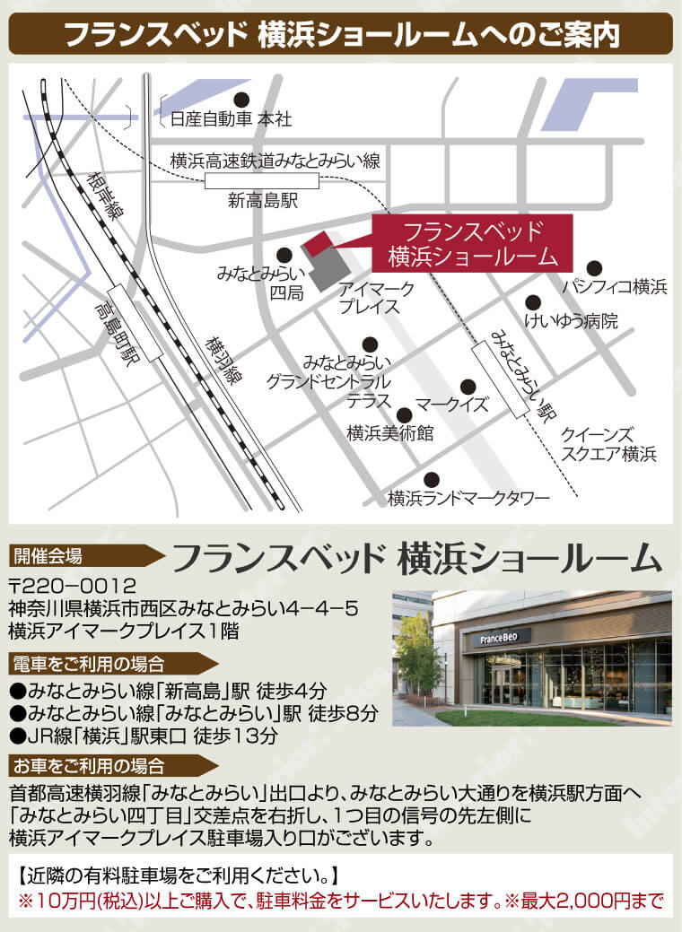 | 会場 | フランスベッド横浜ショールーム 〒220-0012 神奈川県横浜市西区みなとみらい4-4-5 横浜アイマークプレイス1階 |