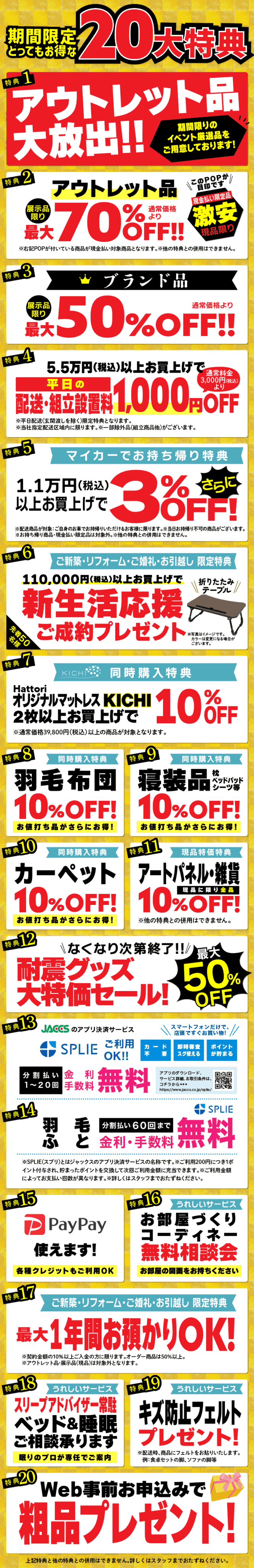 スマートフォンだけで店頭ですぐお買い物ができる分割決済サービスです。たまったポイントは交換して、次回ご利用金額に充当可能。 ●服部家具センターイベント限定特典 羽毛ふとん分割60回まで金利手数料無料。