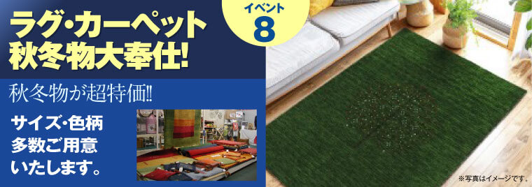 ソファ・パーソナルチェア・リビングテーブル・リビングボード・テレビボード・ベッド・二段ベッド・羽毛ふとん・寝装品・ダイニングセット・ダイニングボード・キッチンカウンター・洋服タンス・整理タンス・絨毯・カーペット・ラグ・カーテン・書棚・シューズボックス・学習デスク・コタツ・コタツ布団 など