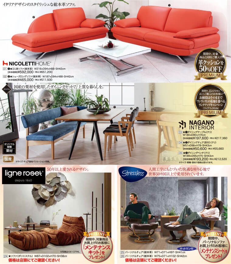 【ナガノインテリア】期間中、15万円(税込)以上ご購入のお客様にお値段はそのままでワンランク上の張地を選べるランクアップキャンペーン(ファブリックのみ)