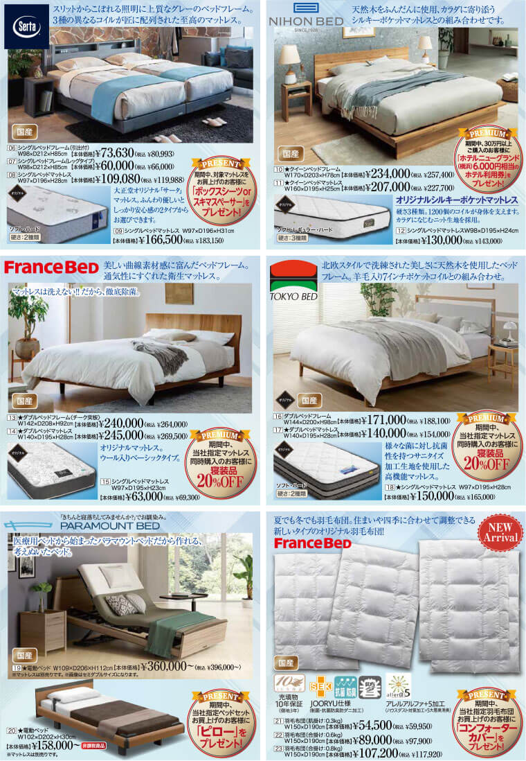 シングルベッド、セミダブルベッド、ダブルベッド、ワイドダブルベッド、クィーンベッド、引き出し付ベッド、リフティングベッド、宮付(棚付)ベッド、ソファベッド、低反発マットレス、羽毛ふとん、寝装品、電動リクライニングベッド、チェストベッド、マットレス下収納ベッド、パイプベッド 他(マットレス、フレームのみの販売可能品有)