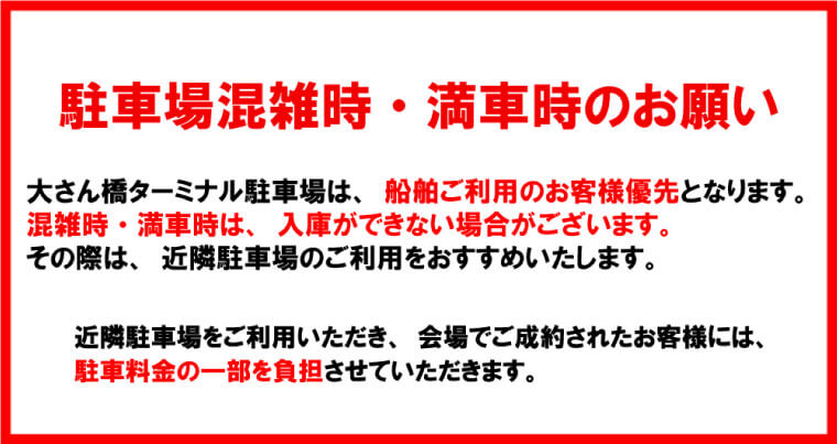 | 駐車場について | ご成約の方には「大さん橋駐車場2時間無料券」を差し上げます。 また、他の駐車場をご利用の場合は、ご成約の方に限り駐車料金の一部を負担させていただきますので、ご契約時にお申し出ください。 なお、大さん橋駐車場は船舶利用客様が優先となり、⾧時間お待ちいただくことやご利用ができない場合もございますので、近隣の駐車場もご利用ください。 |